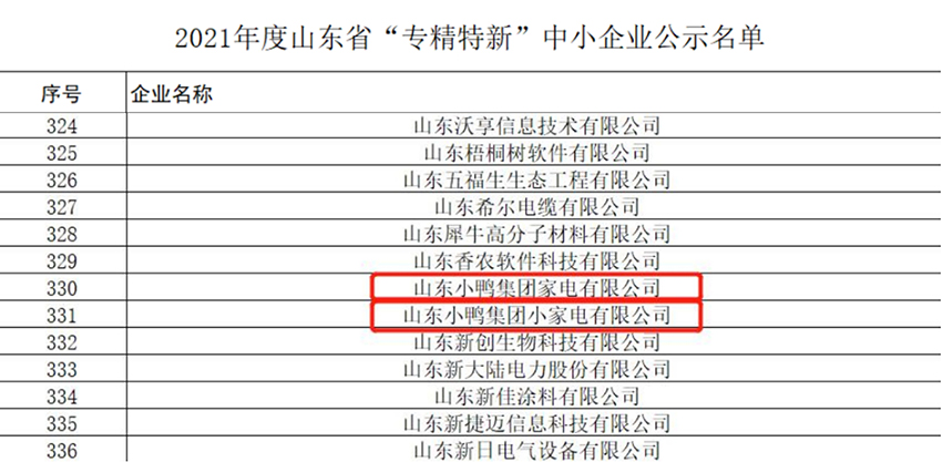 近日,山東小鴨集團(tuán)小家電有限公司在已經(jīng)通過市級專精特新中小企業(yè)認(rèn)定的基礎(chǔ)上,繼續(xù)申請省級專精特新中小企業(yè)認(rèn)定,并通過了工信部的相關(guān)審核,成功入選省級專精特新中小企業(yè)。