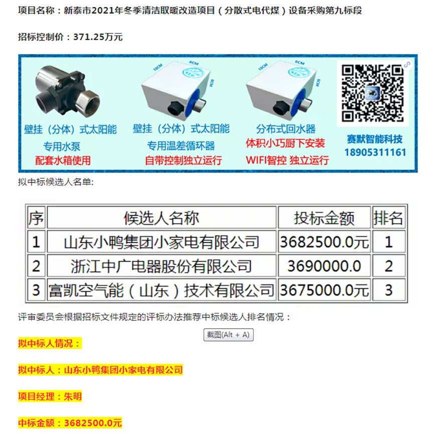 8月26日,泰安市公共資源交易網公示新泰2021年冬季清潔取暖改造項目設備采購第九標段招標結果,山東小鴨集團小家電有限公司作為首位候選品牌,成功中標。