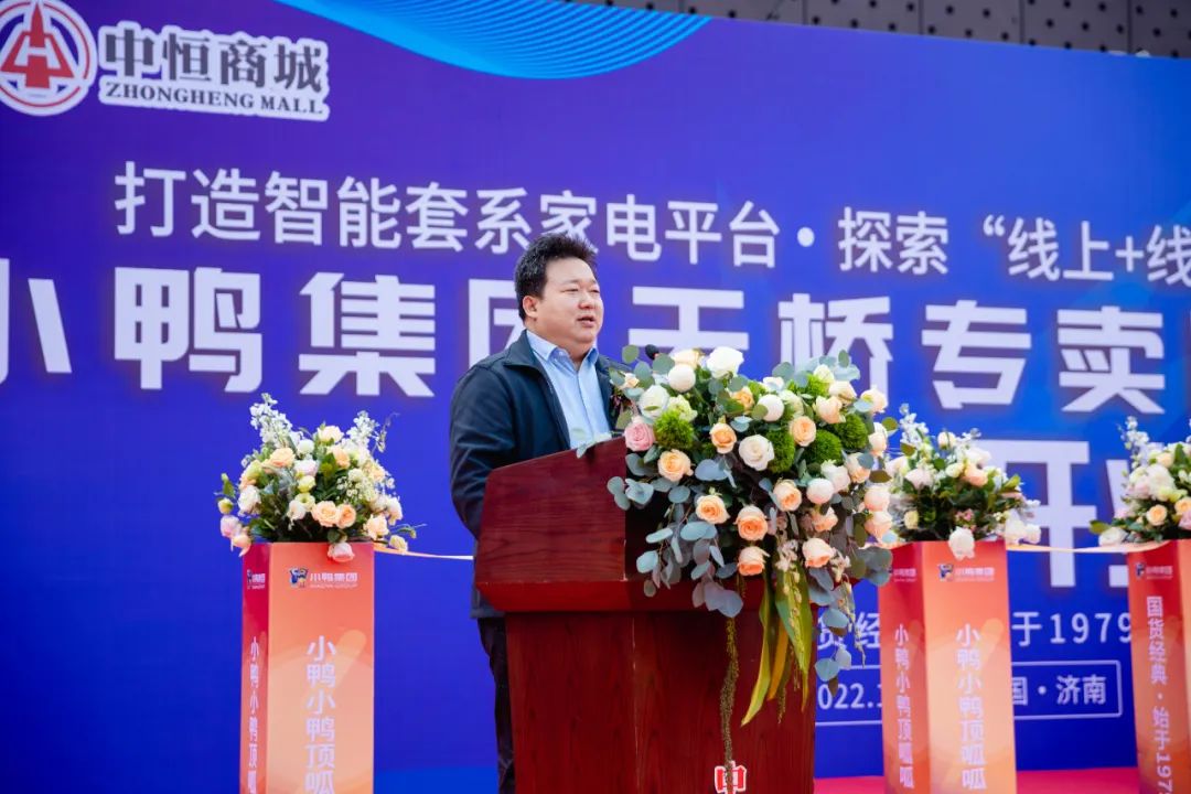 山東省家用電器行業協會會長田占軍致辭,他表示,當前家電行業進入了第四個階段,即產品、質量、品牌和服務的新賽道,小鴨也呈現了嶄新的面貌。小鴨與中恒的強強聯合,定能結出豐碩的果實,在繼續探索家電商品線上加線下的互動服務和營銷方面取得更加長足的進步。